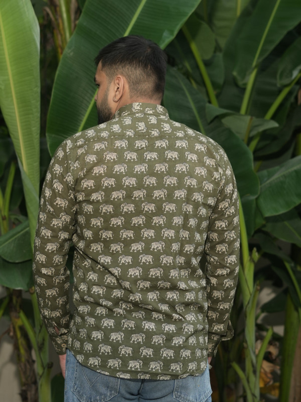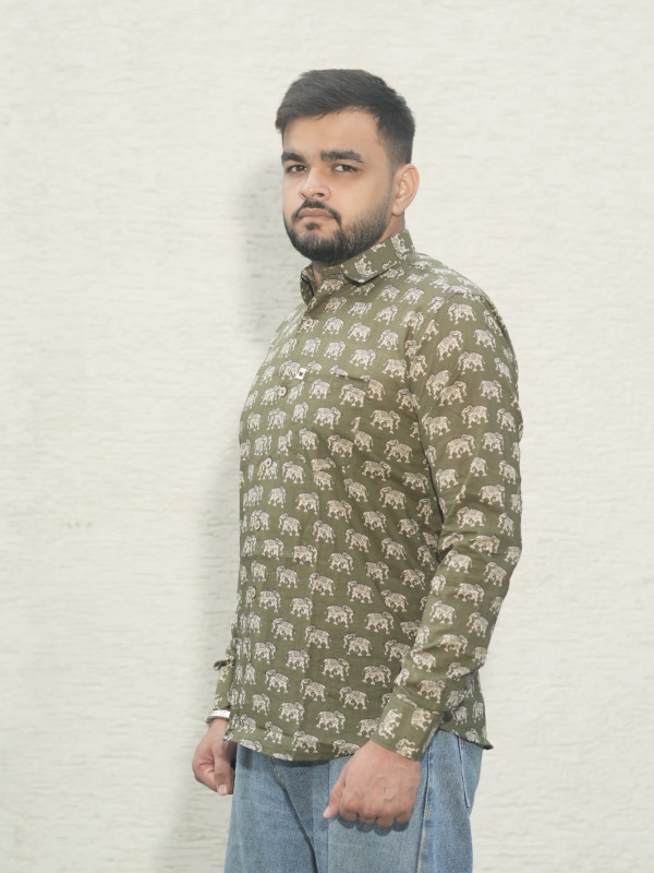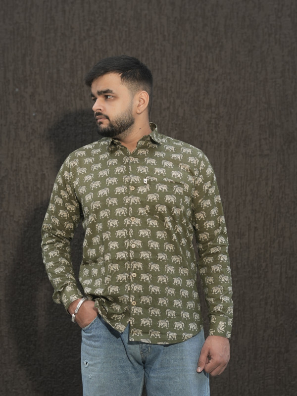 Upgrade your wardrobe with this stylish LE SENSO Men’s Cotton Block Print Shirt, designed with traditional Sanganeri hand block elephant prints on a soothing olive green base. Perfect for both casual outings and festive occasions, this shirt blends comfort with cultural charm.