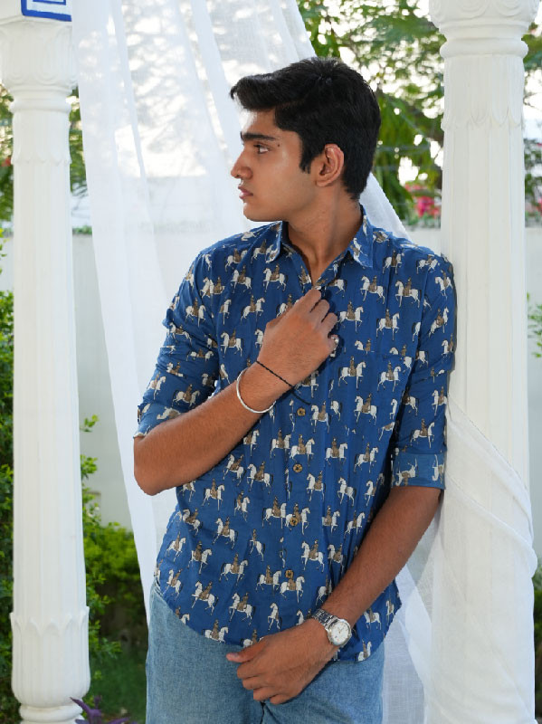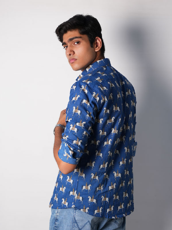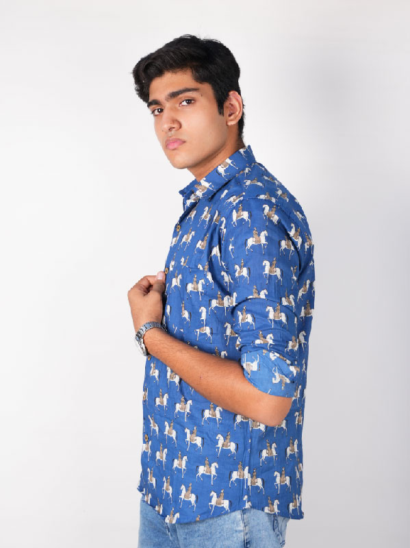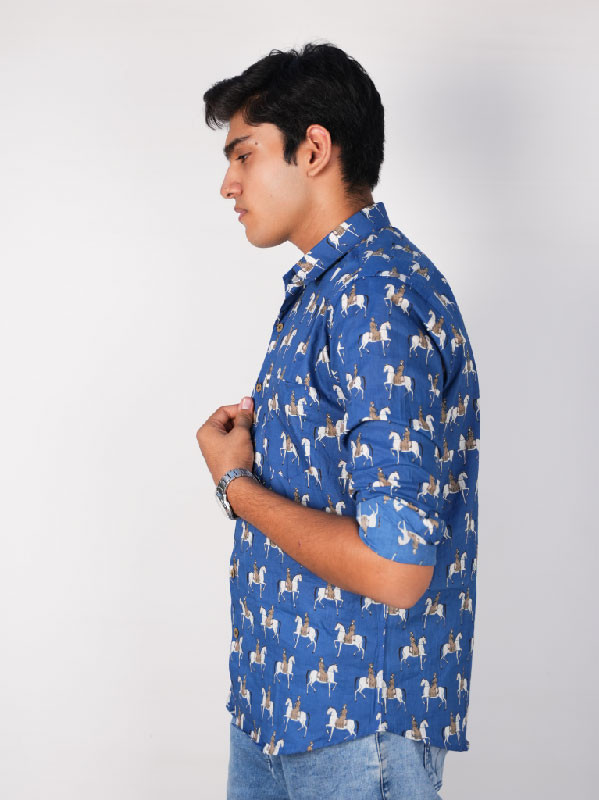 Step into timeless elegance with our Royal Rider Indigo Shirt – a perfect blend of heritage and contemporary charm. Crafted from breathable cotton fabric, this striking blue shirt features an all-over traditional horseman print inspired by regal Rajputana artistry.