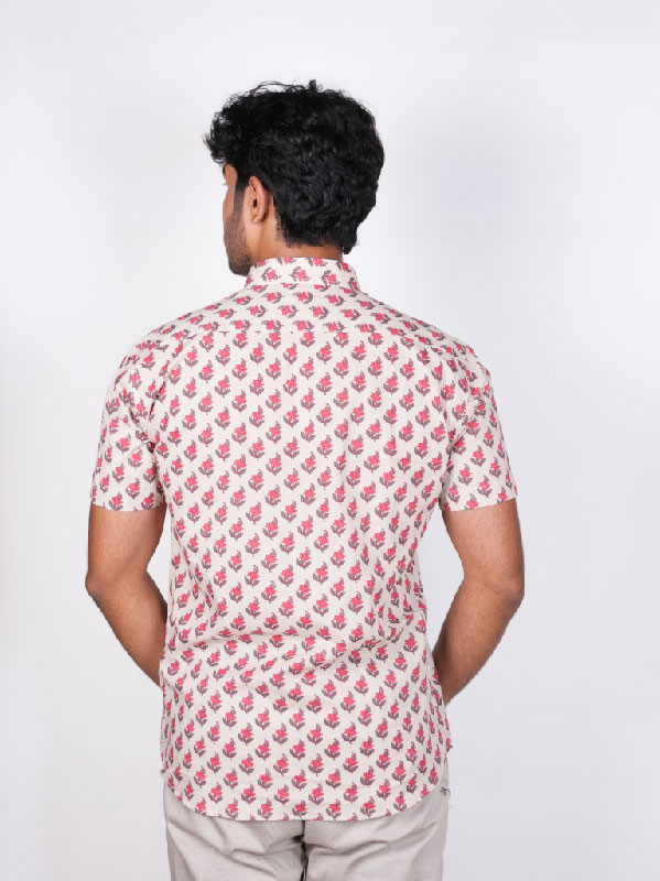 Men's Short Sleeve Floral Printed Shirt, crafted from breathable pure cotton. Featuring a subtle off-white base adorned with hand-block red floral motifs, this shirt brings together comfort and contemporary ethnic style.